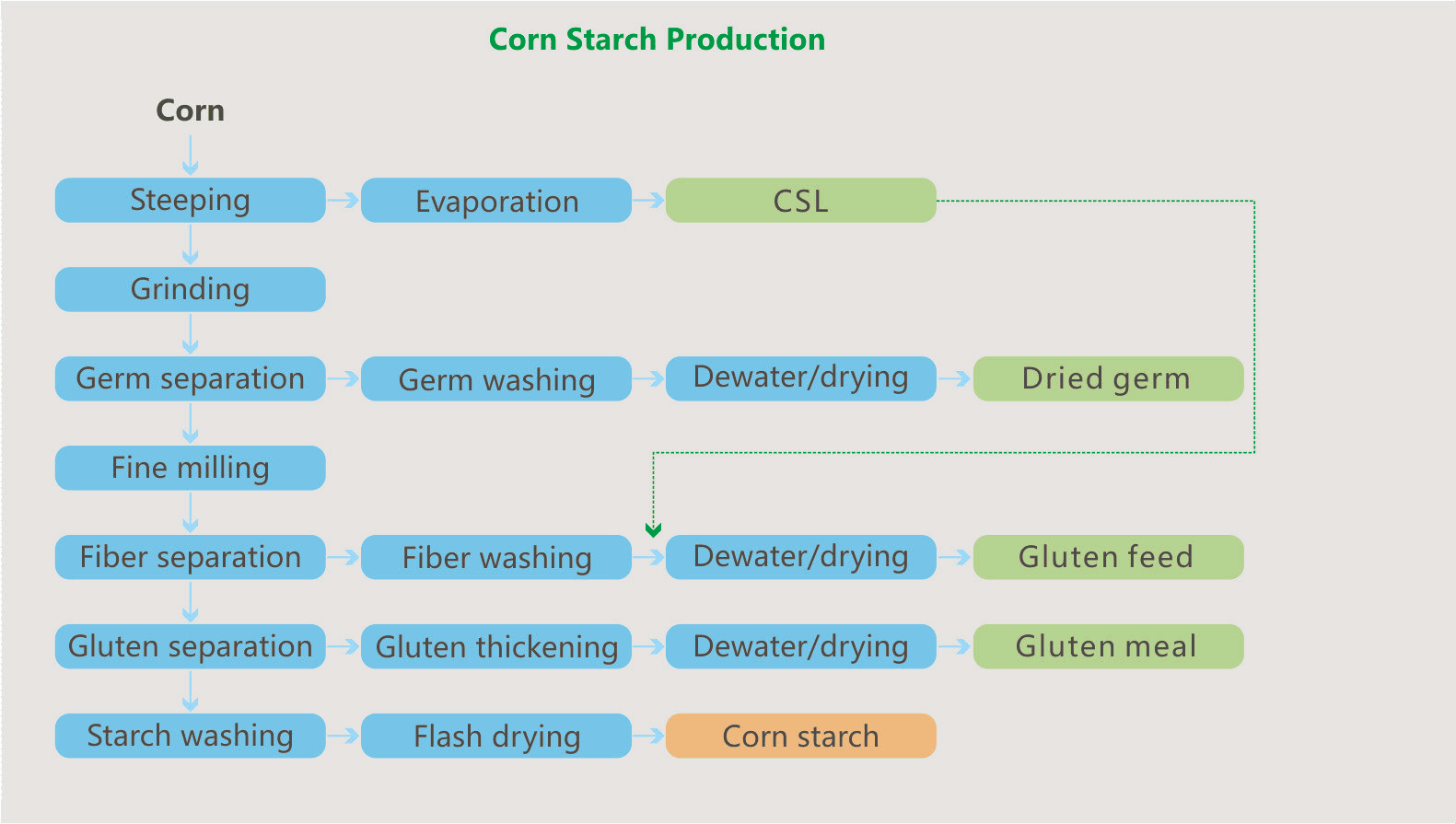 The main production process includes: Corn cleaning – soaking – corn grating – germ separation – corn grinding – starch screening – protein separation and starch washing – centrifugation and drying.