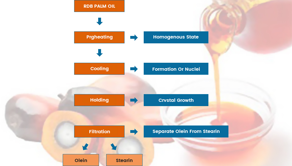 Dry fractionation is used to separate RBD palm oil into olein and stearin. The typical process consists of a crystallisation section and a filtration section. During crystallisation, RBD palm oil is heated and then cooled under a controlled cooling program. The fractionation system uses a vertical cylindrical vessel full of water which is temperature regulated and mechanically agitated at a low speed. When the palm oil enters the vessel, crystal formation and growth occurs as the oil is agitated and cooled by the chilled water. The cooling rate is regulated by controlling the water temperature. The oil becomes a slurry of crystals and remaining liquid oil. The slurry is then fed into a plate and frame type filter press to separate the RBD palm stearin from the RBD palm olein. The solid crystals of the palm stearin are retained on the filter plates.
