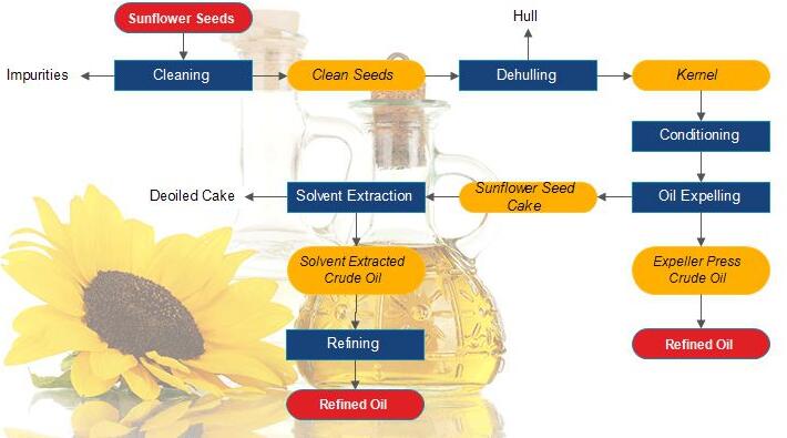 sunflower seed cleaning—shelling—crushing—cooking—pre-pressing—sunflower oil extraction by solvent—sunflower oil refinery—-filling.